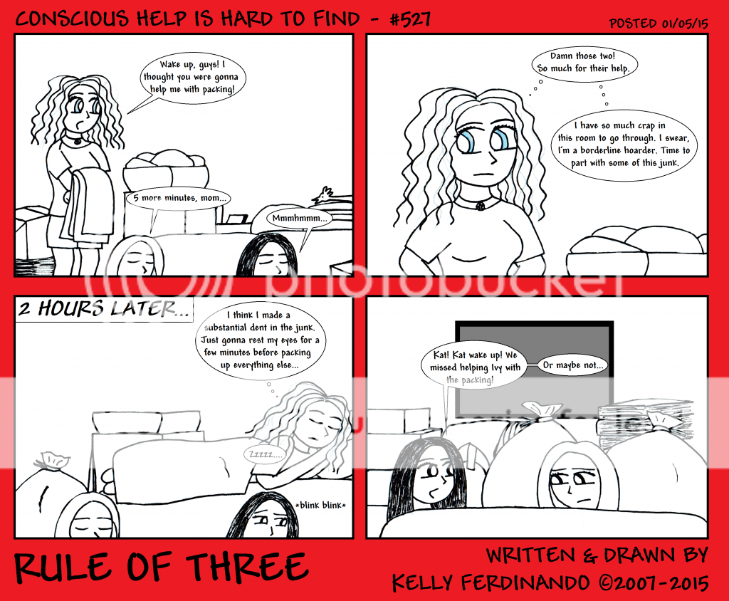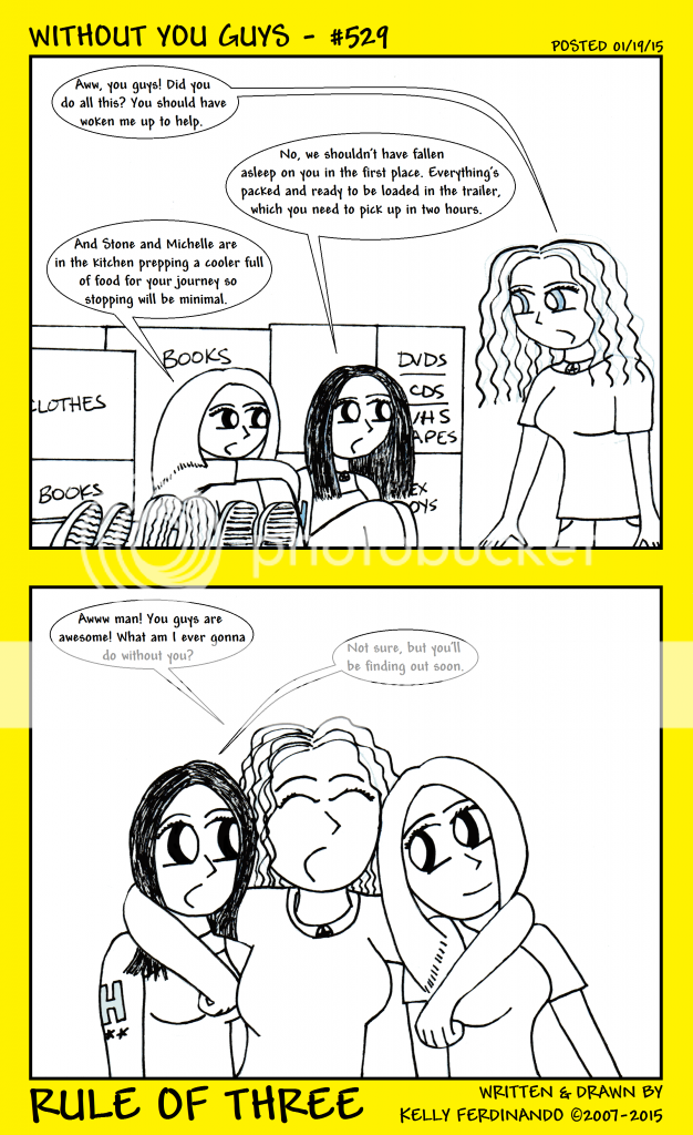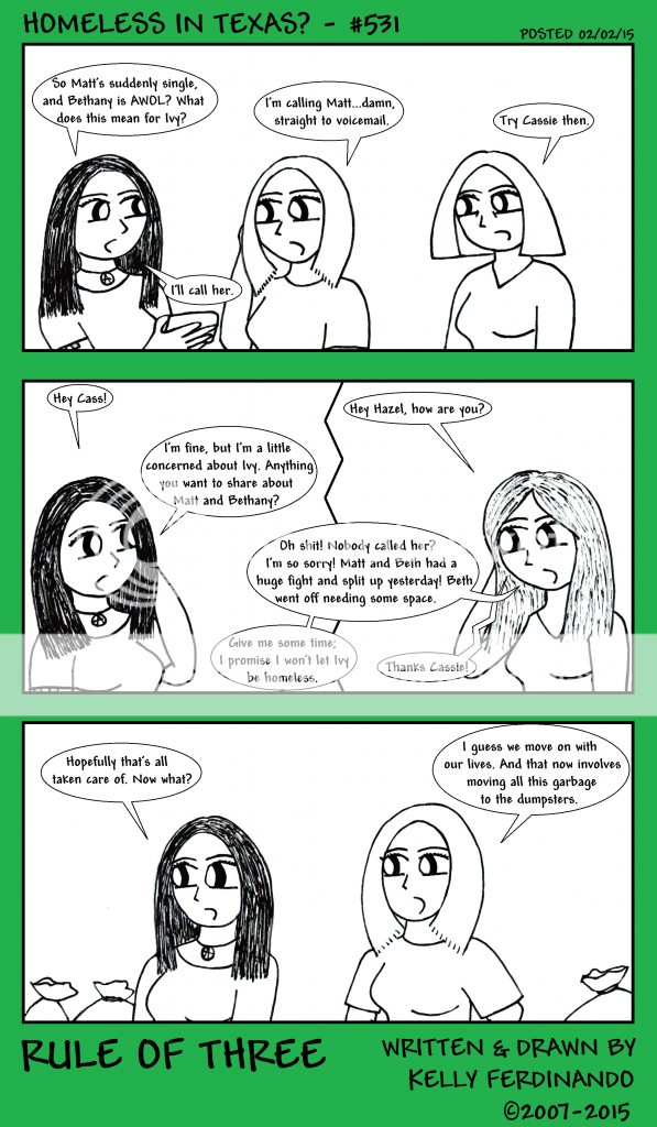 Yes Scotty, I am ending the comic this way. Sorry to disappoint you. I know I left things a little bit cliffhanger-y, but that's how life is sometimes. What are Hazel and Quinn discussing? How will Katerli and Roger's first date go? Will Scotty go for a drink with Floyd in the dumpster? What will life be like for Ivy in Texas (at least that's no mystery, as you can follow her new adventures in Times Like This)?